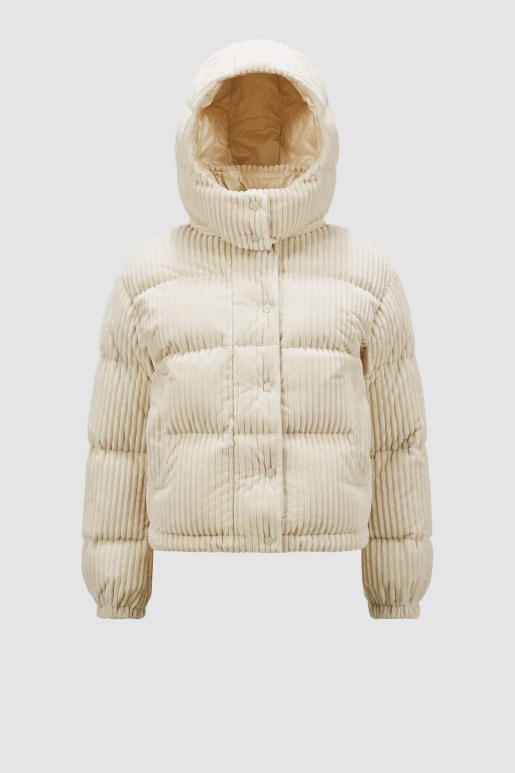 Doudoune courte à capuche Daos pour Femme dans la pure tradition de Moncler réalisé en velours rose poudre rembourré en duvet avec une poche poitrine original garantissant un look stylé et une protection optimale contre le froid.
